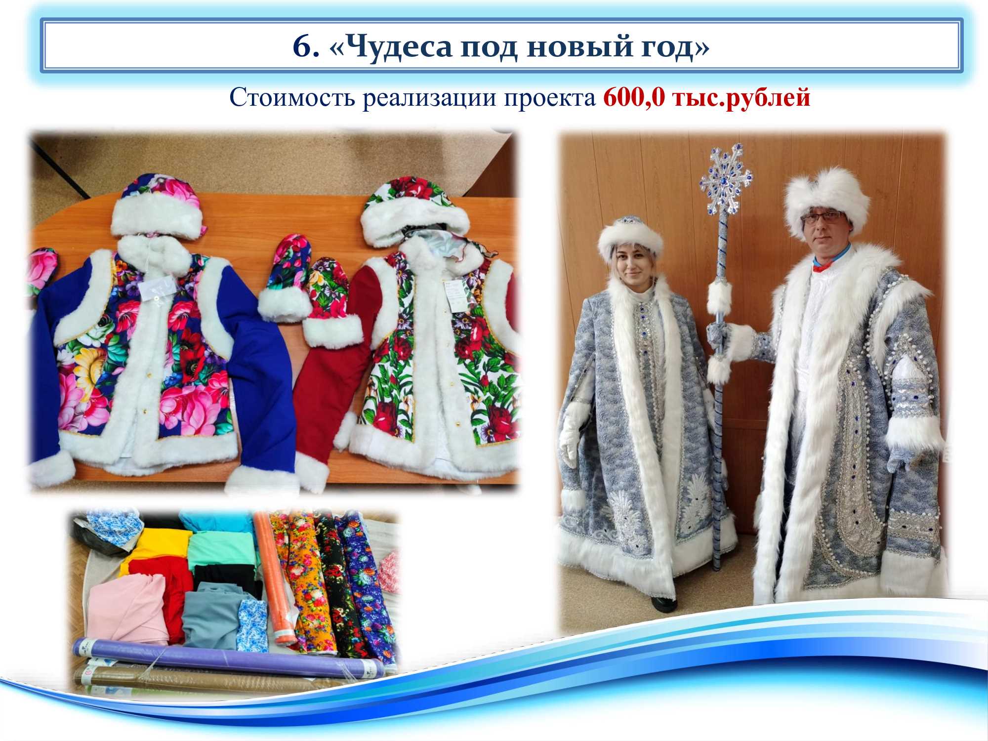 Для открытия городской новогодней елки, проведения новогодних представлений приобретены комплекты костюмов Деда Мороза и Снегурочки из Великого – 169,5 тыс. руб., костюмы для зимних гуляний, приобретена ткань для пошива народных костюмов для хореографических коллективов Центра развития творчества детей и юношества «Кристалл».