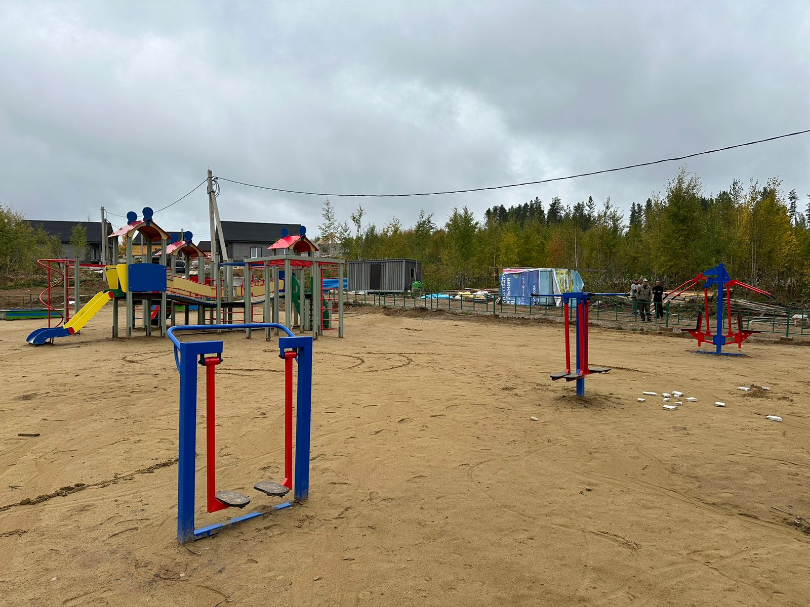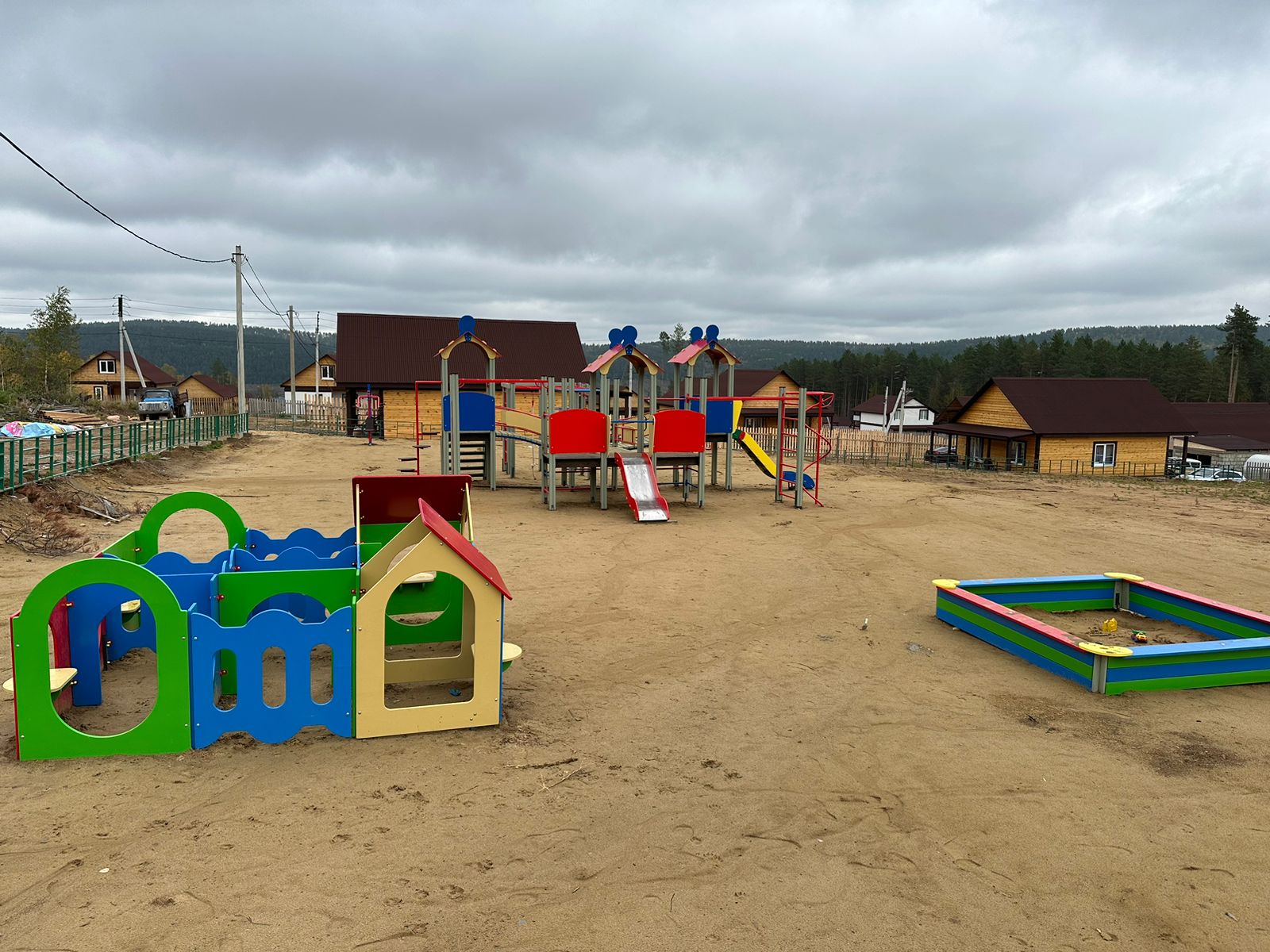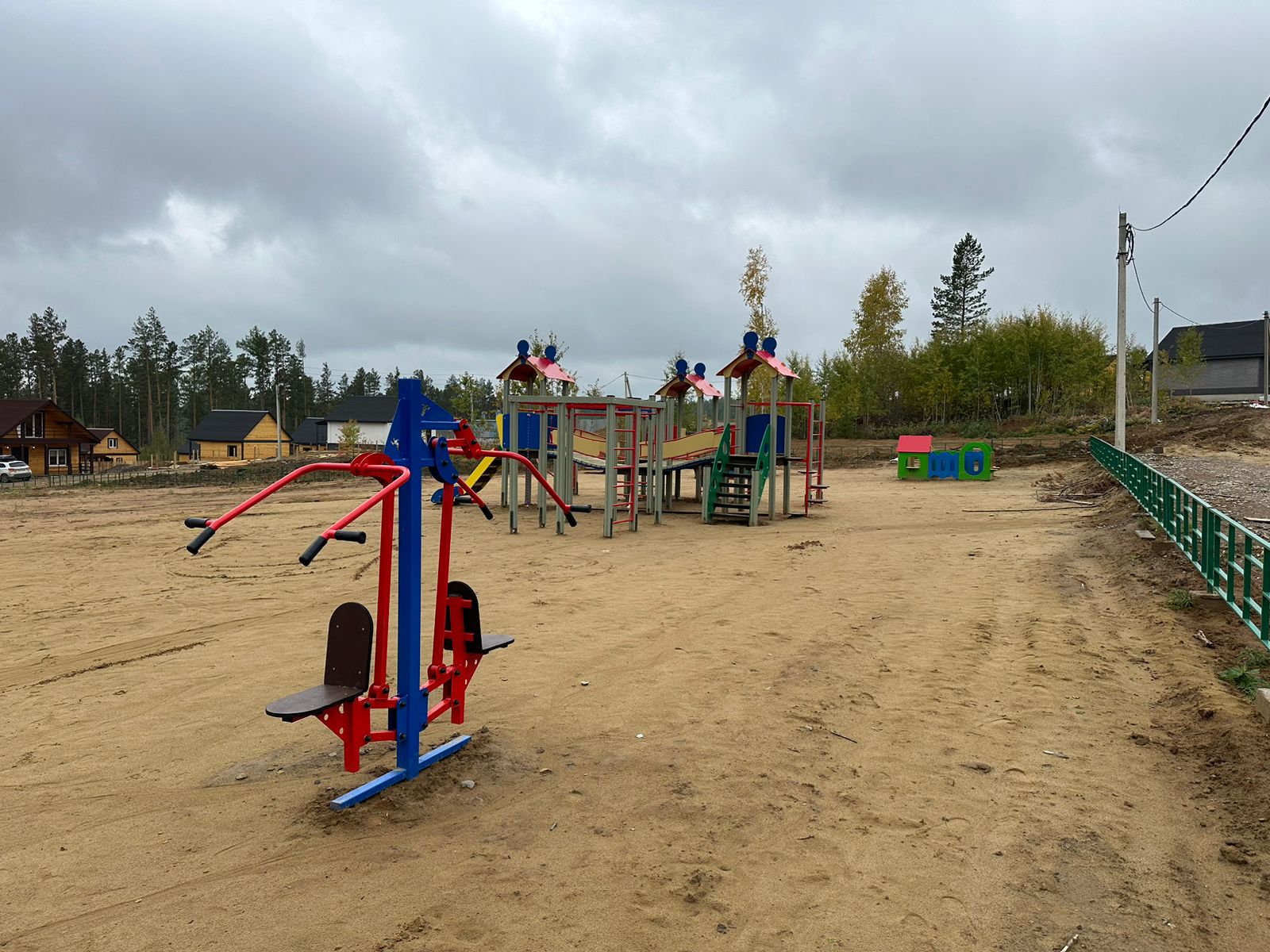 Устройство детской игровой площадки с установкой игровых элементов для разных возрастных групп детей, элементов спортивного оборудования, ограждения территории и видеонаблюдения