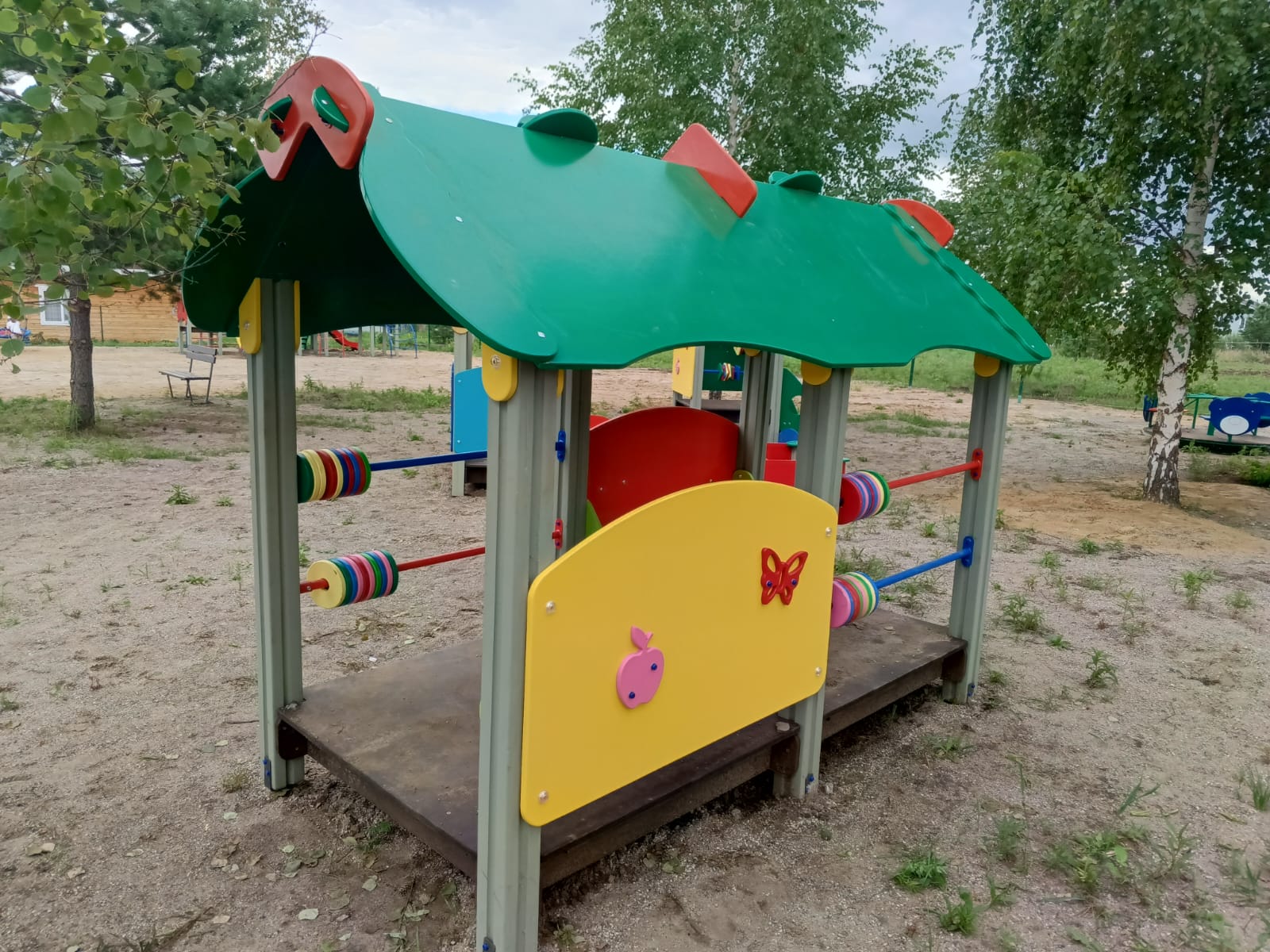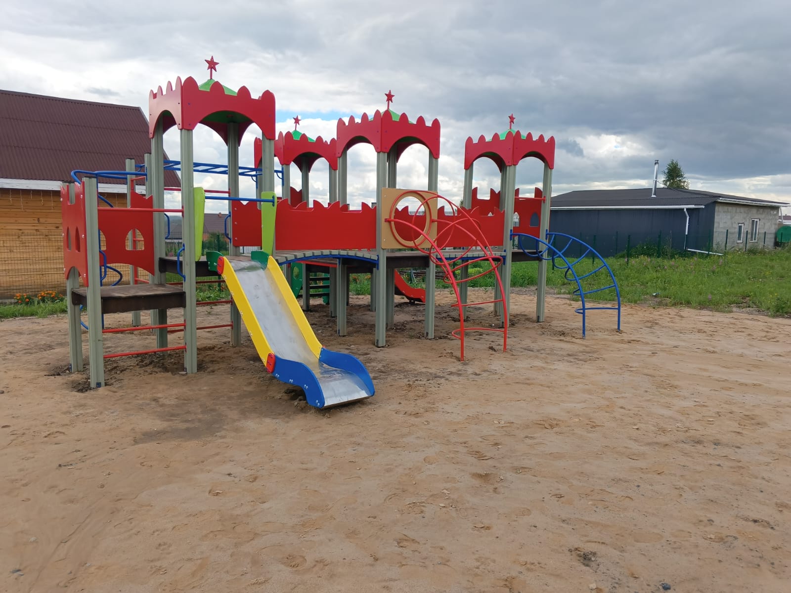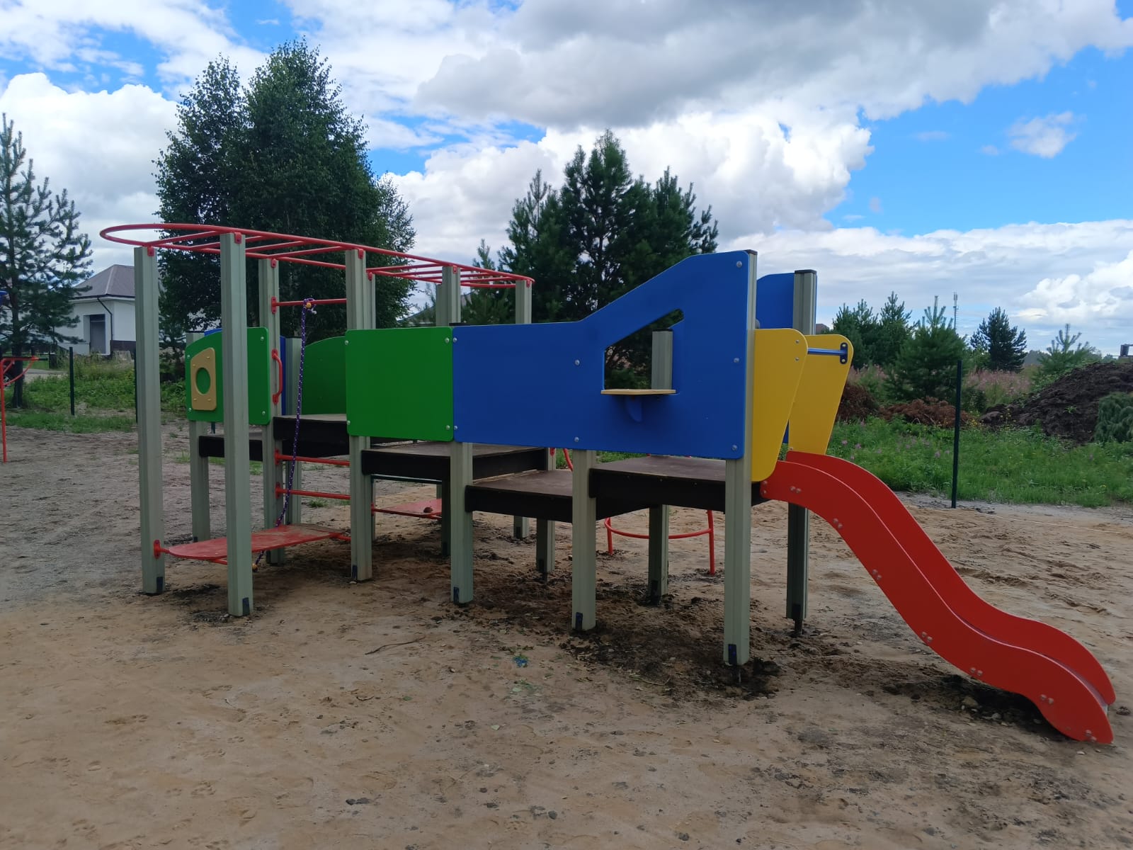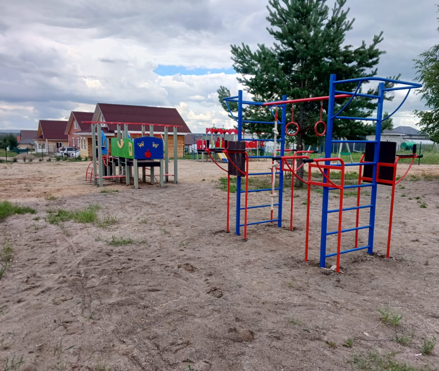 Устройство детской игровой площадки с установкой игровых элементов для разных возрастных групп детей, элементов спортивного оборудования, ограждения территории и видеонаблюдения