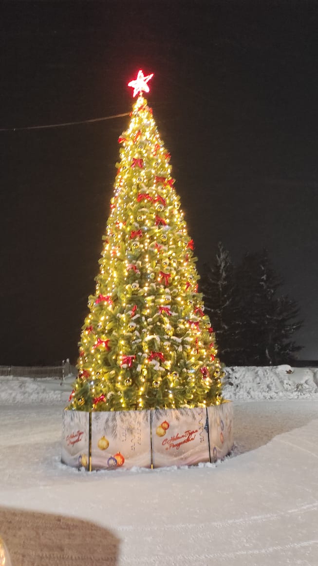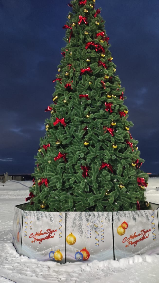 Ель каркасная «Русская», высота 9 м, представляет собой сборно-разборную металлическую конструкцию, состоящую из стального каркаса, покрытого порошковой краской с горячей сушкой, представляющего собой конус с центральным стволом и дугообразными элементами. Ветви изготовлены из стальной проволоки, лески ПВХ. Подиум - необходим для усиления устойчивости конструкции