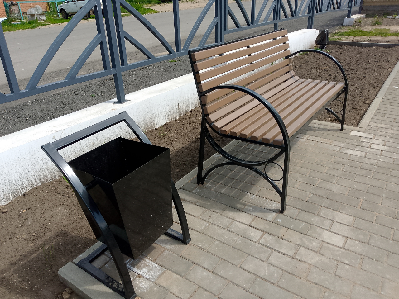 лавочки, урны и освещение. Уложена брусчатка.
