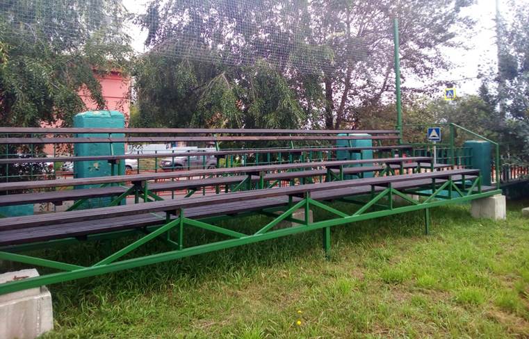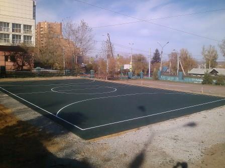 Выполнены работы по выравниванию и отсыпке территории, бетонированию площадки, произведен монтаж резинопола, установлен бордюр, нанесена разметка. Установлено спортивное оборудование: трибуна, сетка безопасности.