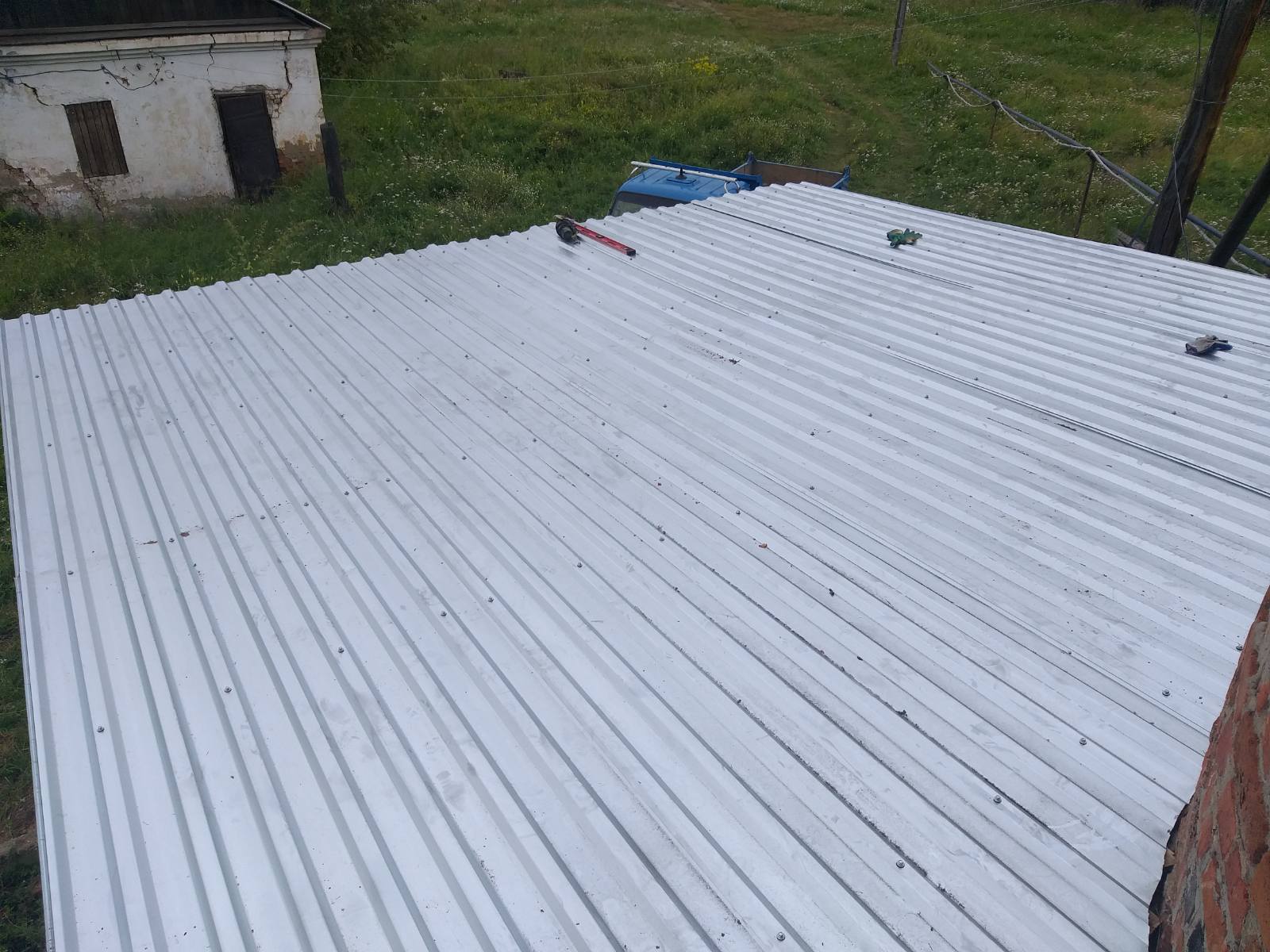 - подготовка основания под мауэрлат, установка мауэрлата из бруса 150*150 мм, стропильная система из доски 50*150 мм, обрешётка 25*150мм, профнастил.